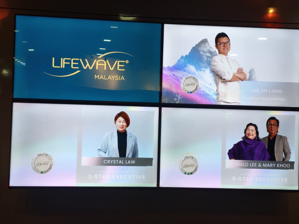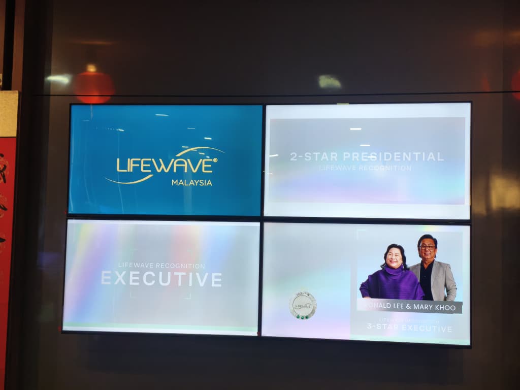 The final product speaks for itself. For the LIFEWAVE project, we delivered a stunning 2×2 video wall layout that beautifully showcased “LifeWave Malaysia” branding and executive recognition slides.